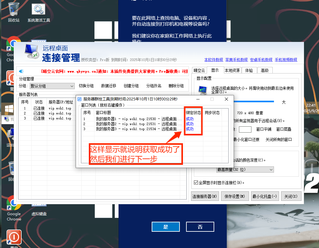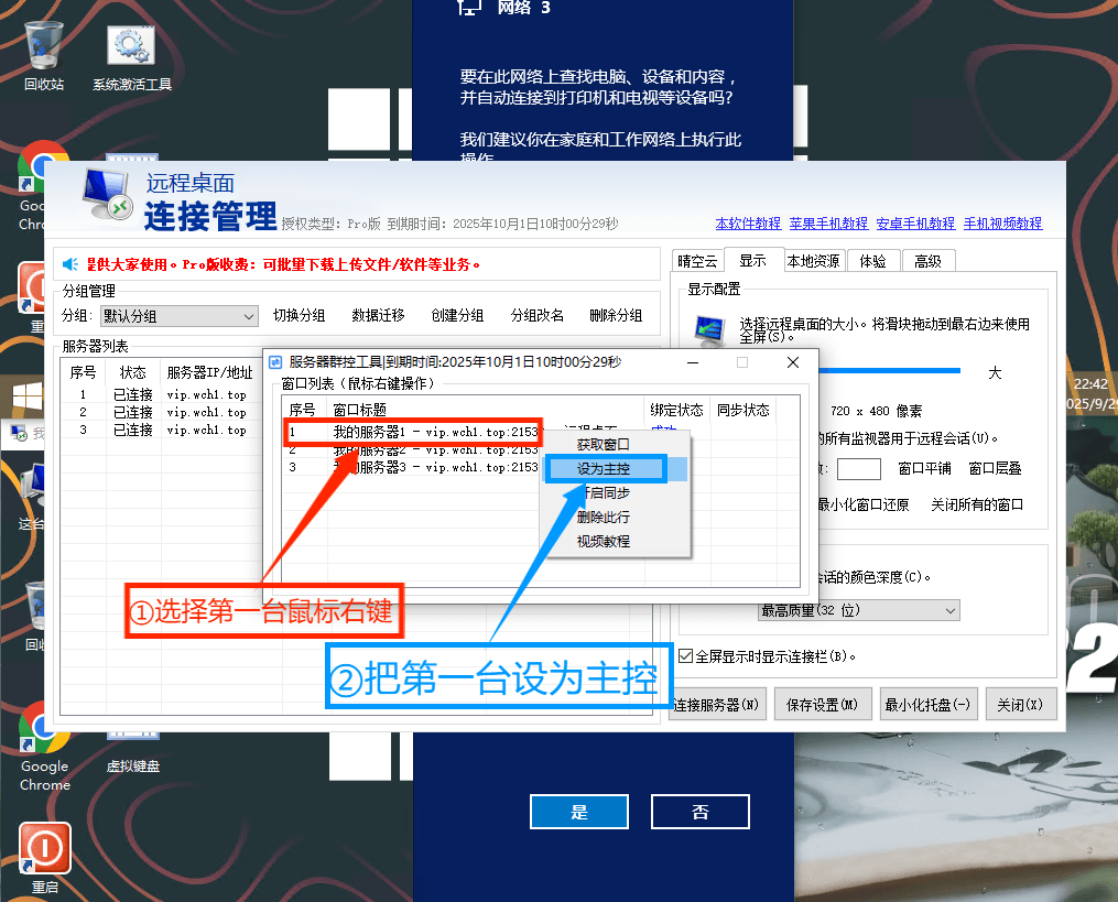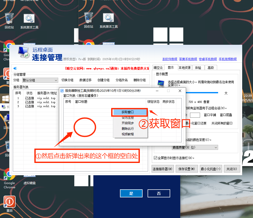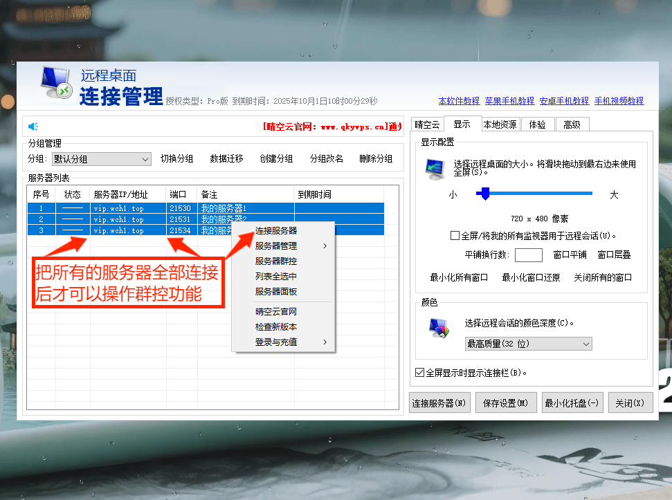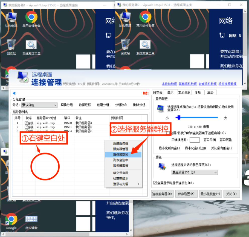②:专业版功能如下包含免费版所有功能。新增:不限制机器登录数量、支持批量导入服务器云电脑(不需要一台台手动添加)、可创建分组、分组改名、删除分组、修改机器备注、最小化所有窗口、最小化窗口还原、一键关闭所有窗口、窗口一键平铺、窗口一键折叠、批量改密、{在官网购买的机器支持改密码/重启/开关机/一键登录控制面板}。量大可免费提供)
